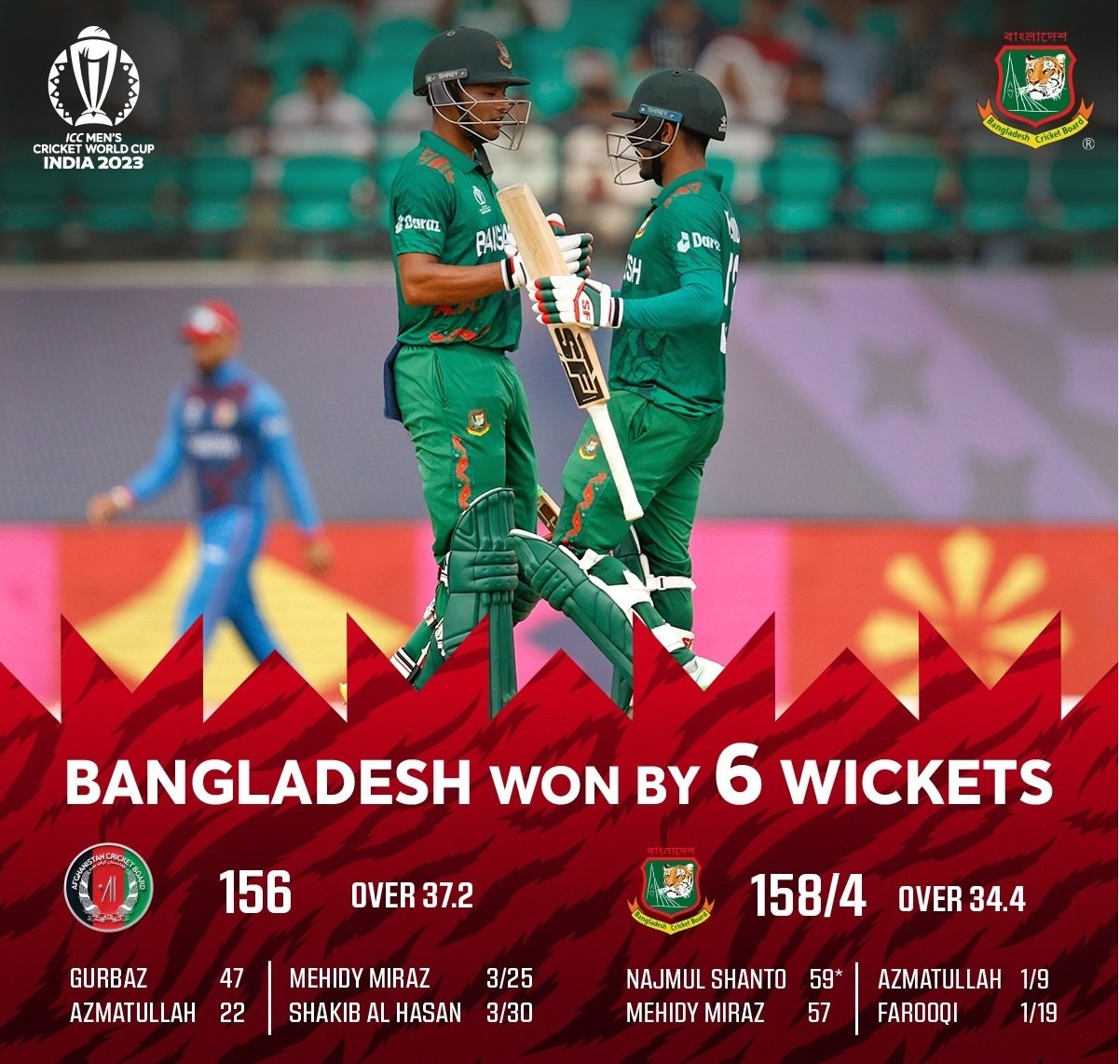 দাপুটে জয় দিতে বিশ্বকাপ শুরু করল বাংলাদেশ। বিশ্বকাপের প্রথম ম্যাচে আফগানিস্তানকে ৬ উইকেটে পরাজিত করেছে সাকিব আল হাসান এর দল।